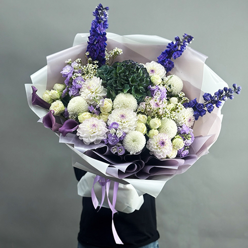 Букет "Поцелуй Джульетты" из Голландской гортензии, георгин, кустовых роз, калл, дельфиниума, ароматных маттиол хризантем Момоко