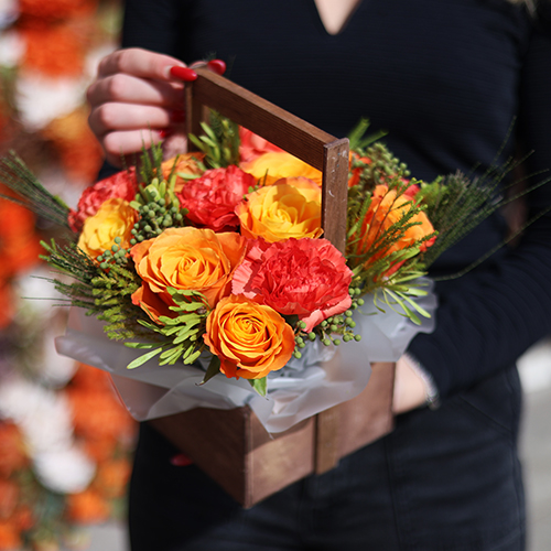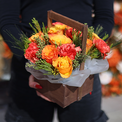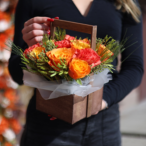 Композиция в ящике из огненных роз, диантусов и капса
